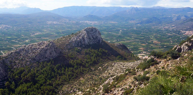 En esta sierra tenemos también El Mirador de Segaria desde donde podemos apreciar unas magnificas vistas como la del Parque Natural de la Marjal de Pego-Oliva, el Castillo de Denia, el Parque Natural del Montgó, las montañas que rodean el valle del rio Girona, las montañas de los valles de Ebo y la Gallinera, el parque Natural de la Sierra de Mariola, y si hay un día claro podemos observar la isla de Ibiza.